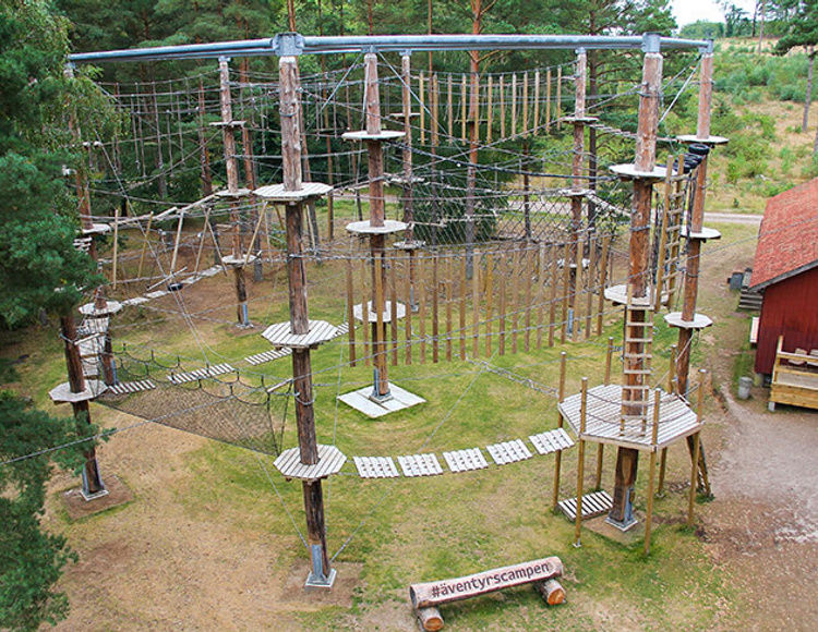 Vår höghöjdsbana är en, i Sverige, helt unik konstruktion. Den består av tre nivåer och har totalt 54 olika stationer. Nu har vi även byggt ett linbanesystem som du kan välja om du vill lägga till när du bokar-se nedan!
